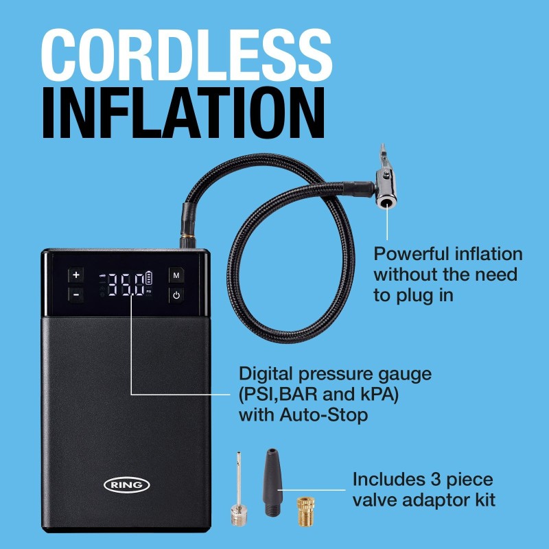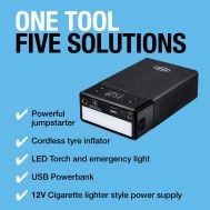 The Ring JUMPSTART 5-IN-1 is the ultimate roadside companion. It features a powerful jump-starter capable of starting engines upto 5L petrol and 3L diesel with boost function for completely flat batteries, a digital tyre inflator with auto-stop, a USB-powerbank, 12V power supply and a bright integrated torch with SOS and Red Light for emergencies.