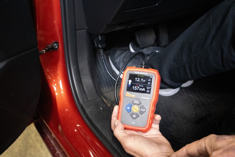 Monitors car battery voltage and parasitic current draw for accurate diagnostics.