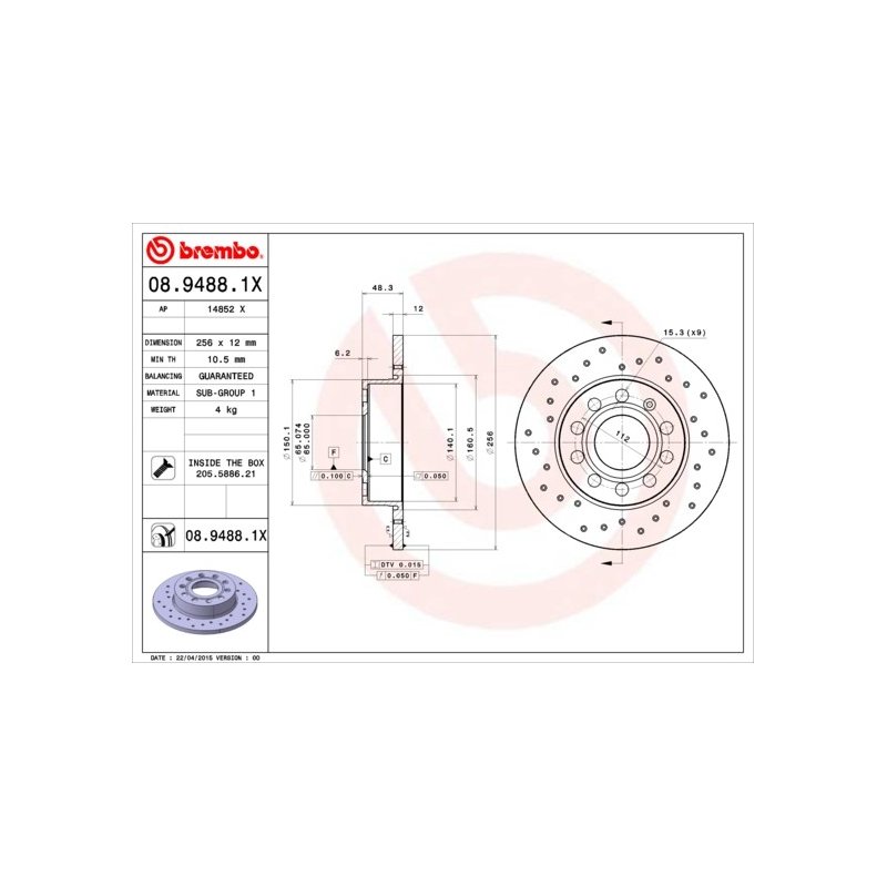 Premium Brake Disc BREMBO 08.9488.1X OE Ref 1K0615601AJ for AUDI, SEAT, SKODA, VW
