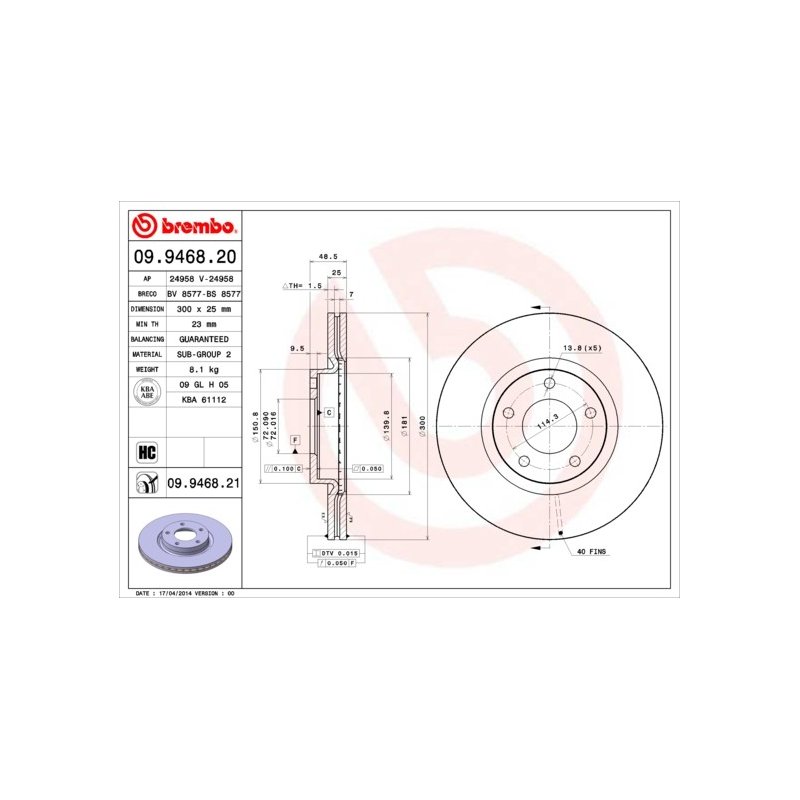 Precision-Engineered Brake Disc BREMBO 09.9468.21 OE Ref BP6Y3325XE for Your Vehicle