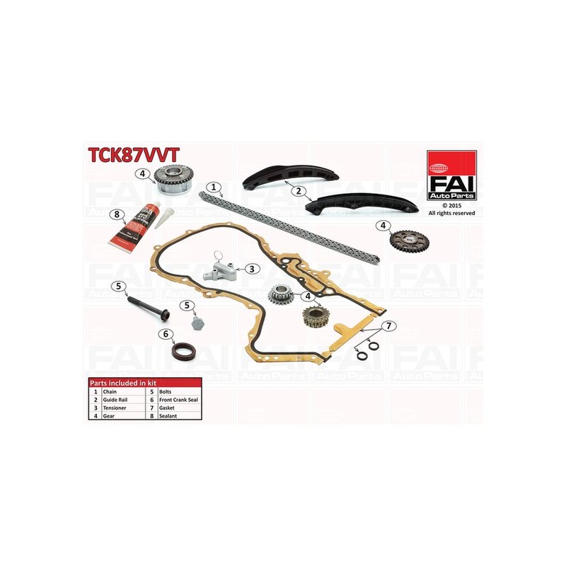 Enhance your vehicle's performance with this high-quality Timing Chain Kit FAI OE Ref 03C105209AG, specially crafted for AUDI, SEAT, SKODA, VW. As an ideal replacement for OEM Part Number 03C105209AC, this component is manufactured by the trusted brand FAI. With Reference Number TCK87VVT and EAN EAN: 5027049350571, this part ensures a perfect match to your vehicle’s original specifications. Available for just £272.89 (inclusive of VAT), it provides unbeatable value without compromising on quality.