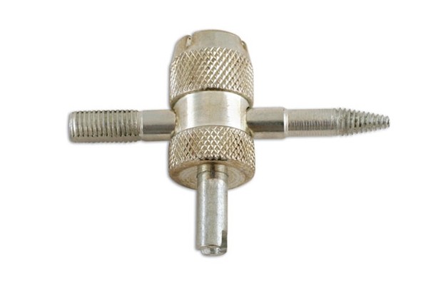 An old favourite, can be used to clean up the threads of a schrader valve body both internal and external as well as remove the valve core (vital for tyre changing) and clean up the valve core seat in the valve body (tapered screw cleaner)