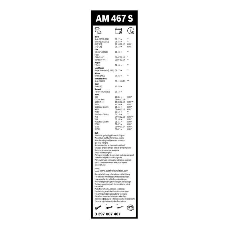 At e Auto Parts, we take pride in offering high-quality automotive parts, like this Wiper Blade BOSCH 3 397 007 467, designed specifically for ALPINA, BMW, FIAT, FORD, JAGUAR, LAND ROVER, MERCEDES-BENZ, NISSAN, OPEL, RENAULT. With a precise match to OEM Part Number , this part is manufactured by BOSCH to ensure durability and exceptional performance. Priced at £44.78, including VAT, it comes with Reference Number 3397007467 and EAN EAN: 4047024458642 for easy identification.