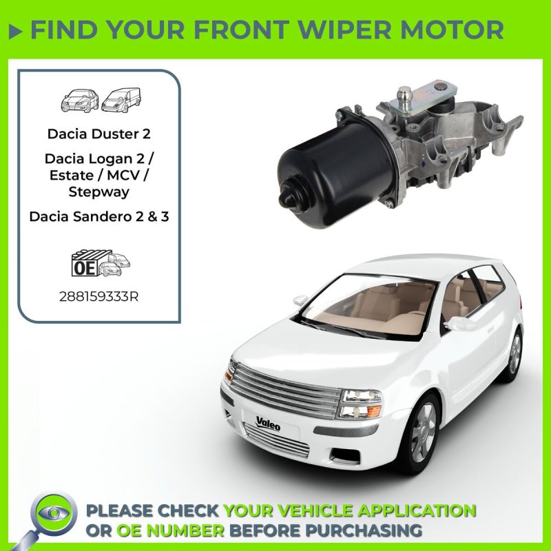 To ensure compatibility, simply enter your vehicle registration number in the tool above or choose your vehicle from the dropdown menu. Cross-check the OEM Part Number 288159333R to confirm the exact match. In case this Wiper Motor VALEO OE Ref isn't the perfect fit, explore our extensive Wiper & Washer System category for other options.